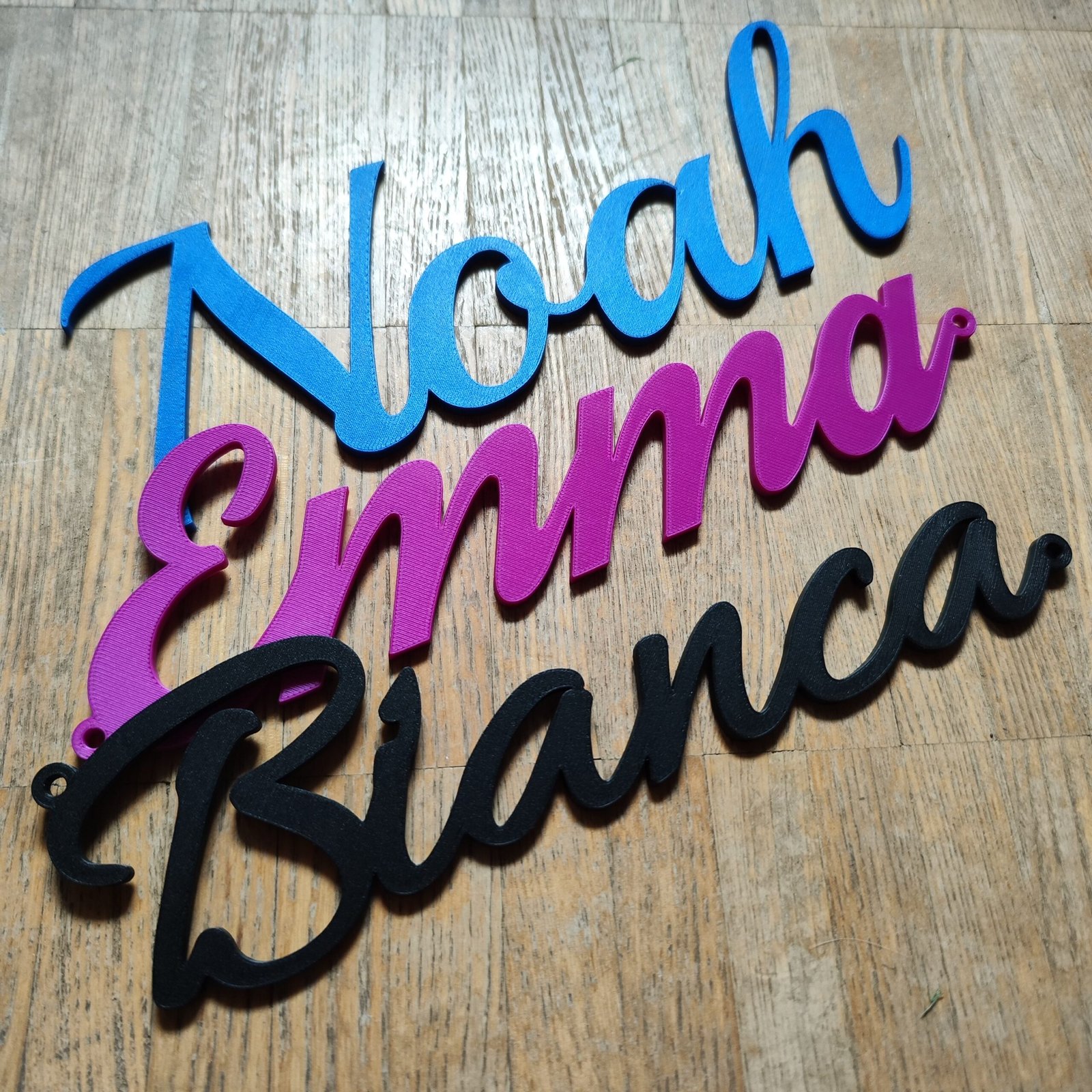 Each custom name sign is made to order using durable, eco-friendly PLA plastic and printed in your chosen cursive script font. Available in multiple sizes and tones — from girly pinks, baby boy blues, classic black, elegant silver, or pure white — our signs complement a wide range of nursery and children’s room themes. These decorative name signs for girls and boys are ideal for everything from crib name sign decorating to cute doorsigns for young kids.